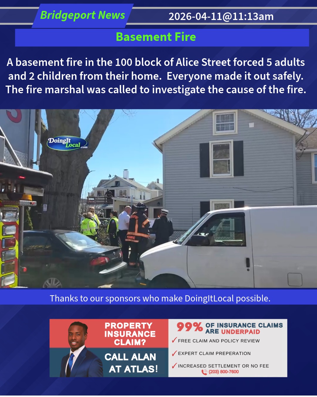 A basement fire in the 100 block of Alice Street forced 5 adults and 2 children from their home. Everyone made it out safely. The fire marshal was called to investigate the cause of the fire.