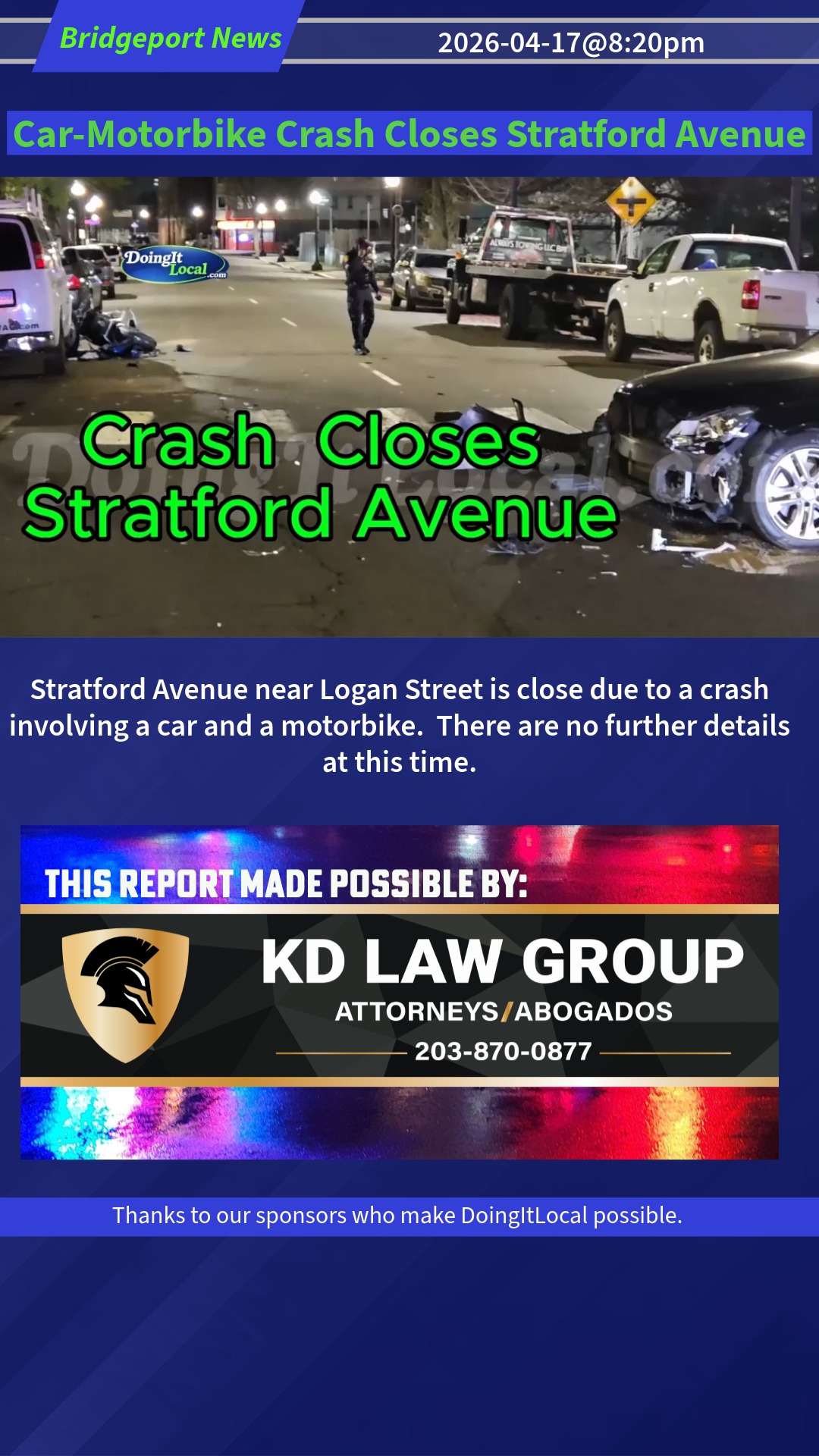 Stratford Avenue near Logan Street is close due to a crash involving a car and a motorbike. There are no further details at this time.