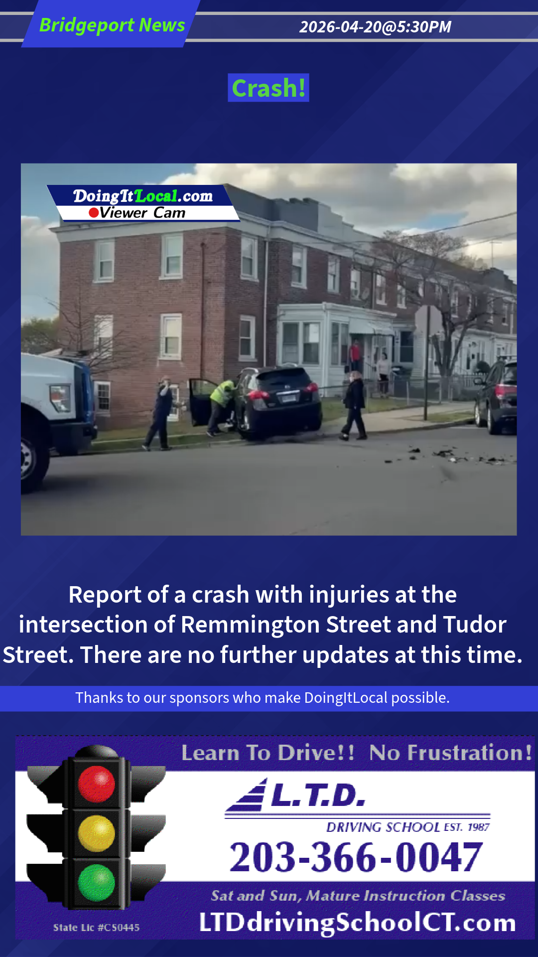 Report of a crash with injuries at the intersection of Remmington Street and Tudor Street. There are no further updates at this time.