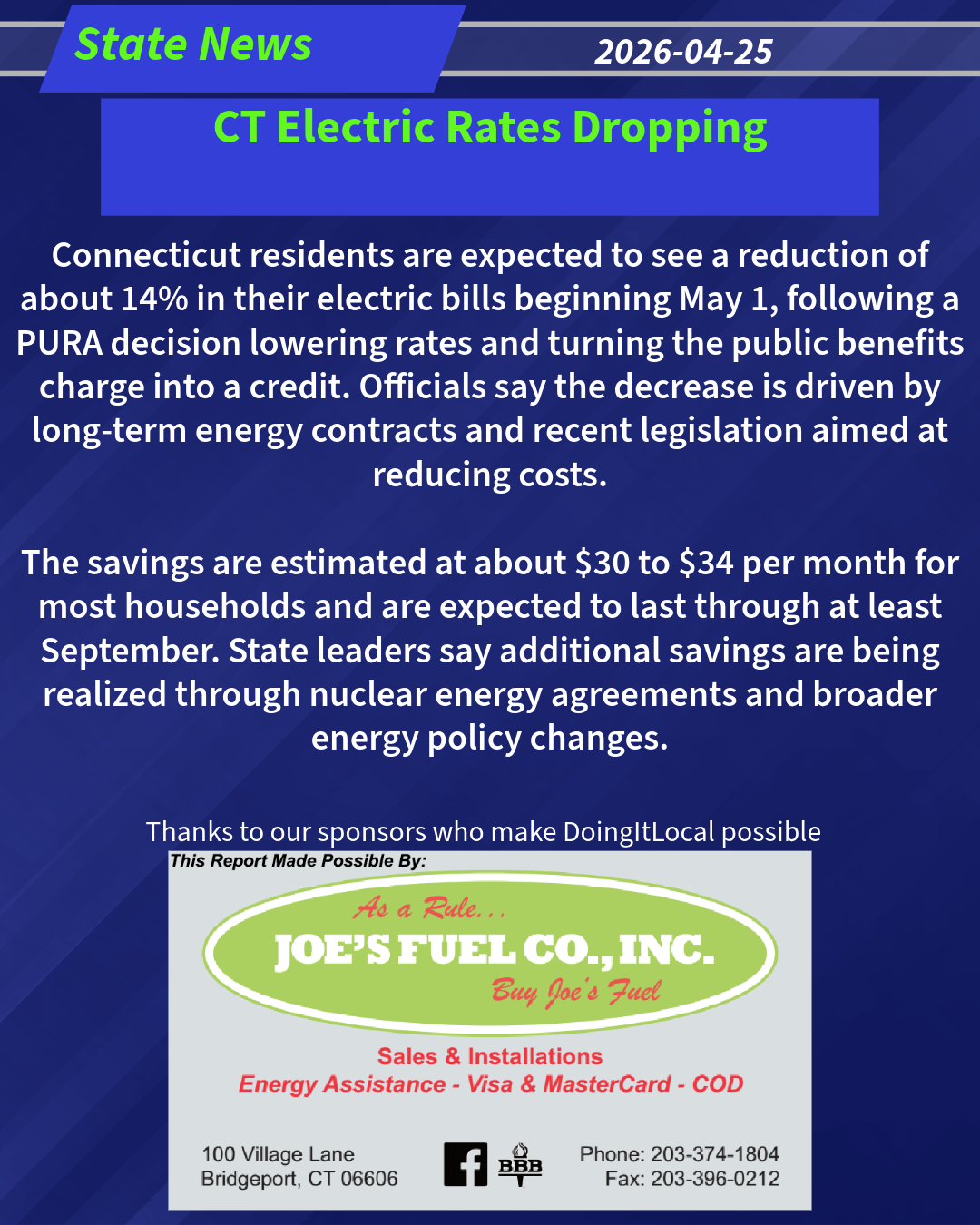 “Connecticut ratepayers are about to see some welcome relief on their electric bills, due in large part to the difficult decisions made when electricity prices were low,” Governor Lamont said. “The rate reduction residents are seeing today is the result of sound policy work – long-term contracts and legislation designed to produce lasting results – not quick fixes geared for headlines. That’s the kind of governing that actually moves the needle for families struggling with high costs.”