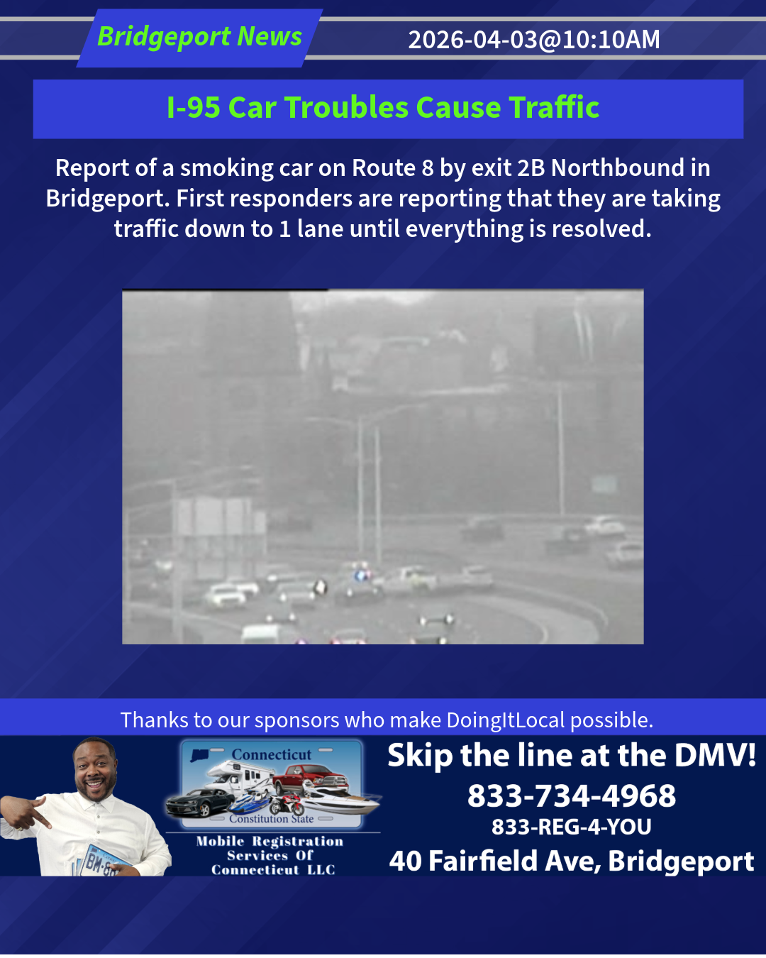 Report of a smoking car on Route 8 by exit 2B Northbound in Bridgeport. First responders are reporting that they are taking traffic down to 1 lane until everything is resolved.