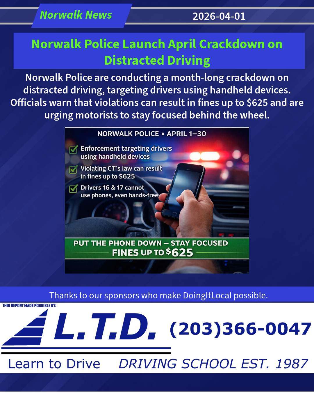 The Norwalk Police Department is partnering with the Connecticut Department of Transportation in recognition of National Distracted Driving Awareness Month this April.