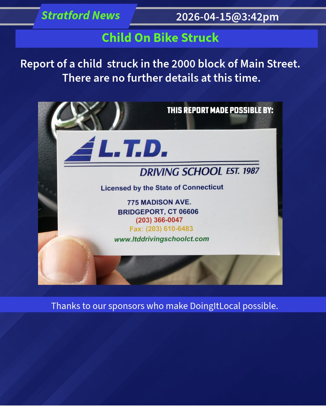 Report of a child struck in the 2000 block of Main Street. There are no further details at this time.