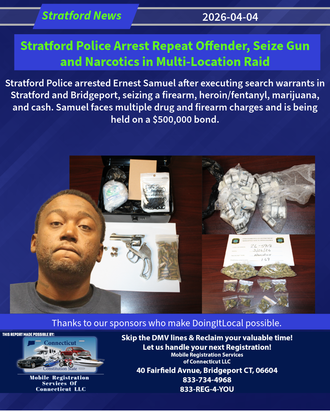 On March 26, 2026, at approximately 0630 hours, the NVI Unit’s investigation culminated with the execution of three search warrants. One at 24 Enrica Rita Way, Stratford, CT, one at the Bridgeport Innovation Center, which is located at 955 Connecticut Avenue, Building One, Suite 1307, 3 rd floor and the person of Ernest Samuel (09-28-1985).
