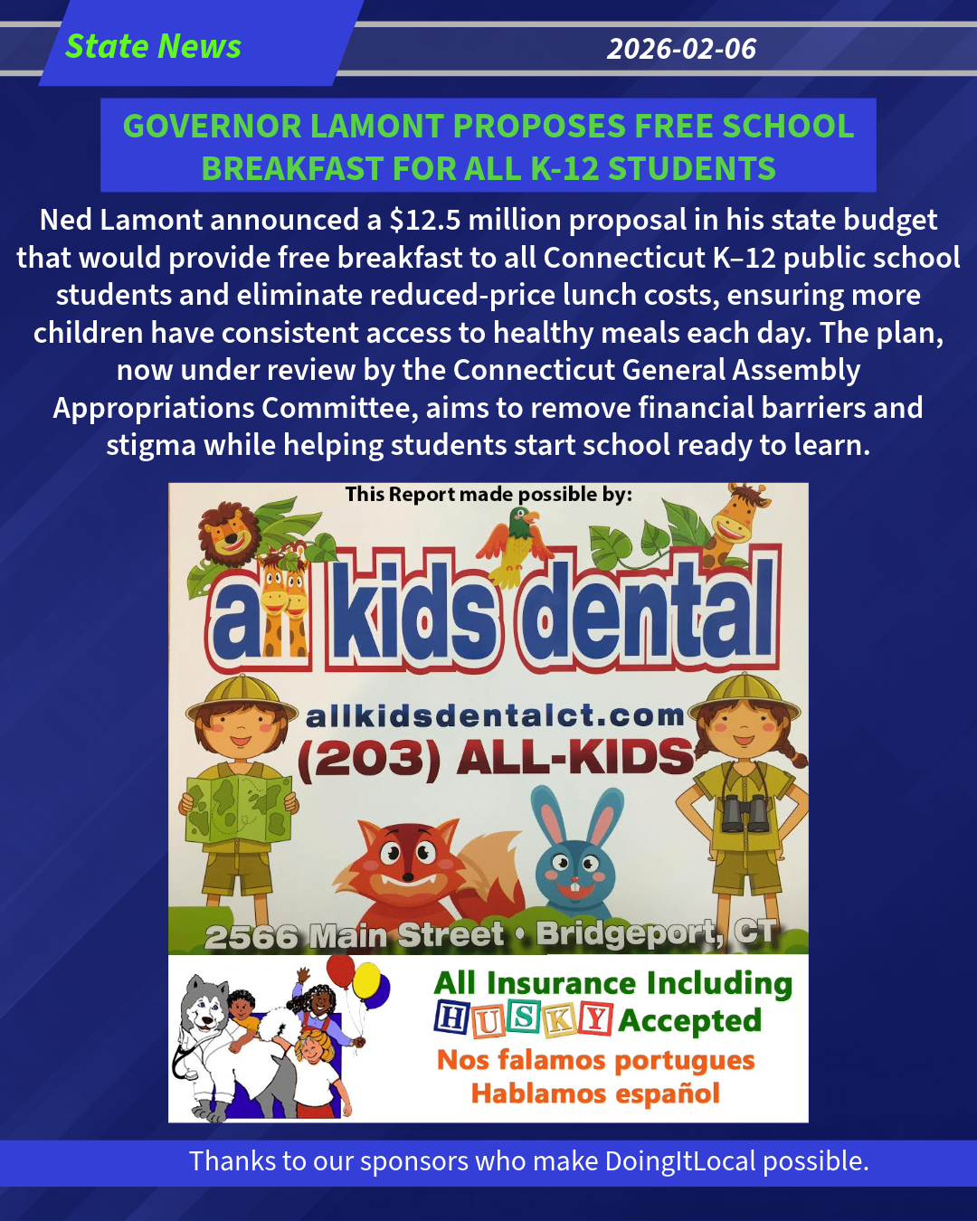 (HARTFORD, CT) – Governor Ned Lamont today announced that the state budget proposal he presented to the Connecticut General Assembly yesterday includes the funding necessary to provide all K-12 public school students in the state with breakfast at no cost to them or their families at the start of each school day. Additionally, it includes funding to eliminate reduced-price lunch charges, making lunch free for students who currently qualify for reduced-price lunches. Governor Lamont said that this $12.5 million investment is important in ensuring that all children have access to healthy meals, especially at the start of each school day. The proposal is currently being considered by the legislature’s Appropriations Committee. “A healthy breakfast provides kids with the opportunity to…