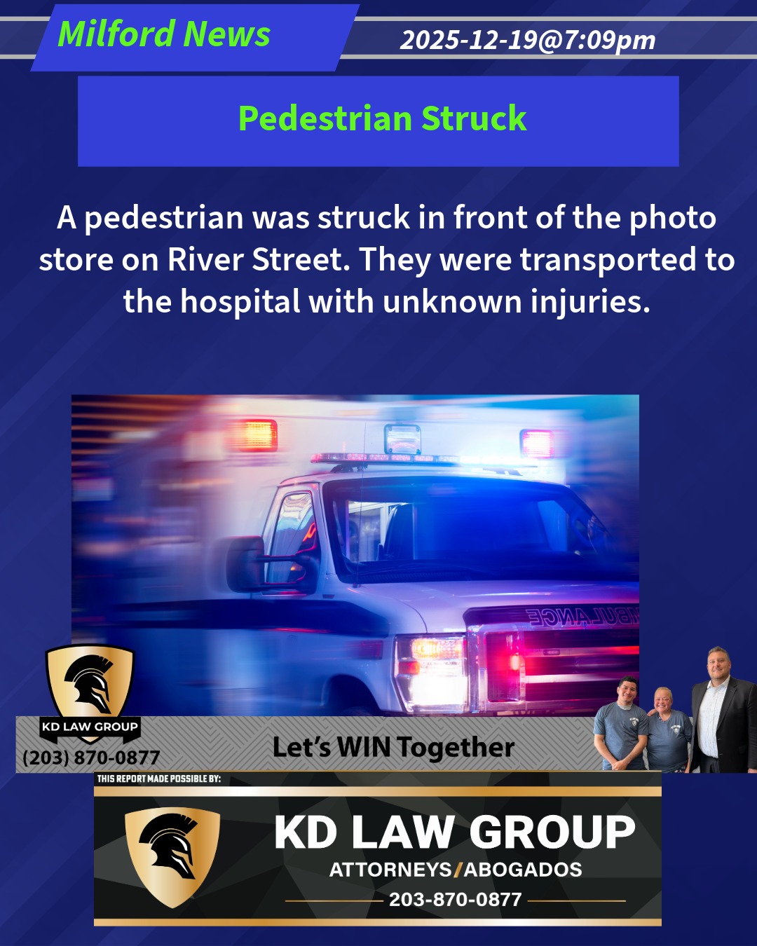 A pedestrian was struck in front of the photo store on River Street. They were transported to the hospital with unknown injuries. 2025-12-19@7:09pm-- #Milford CT