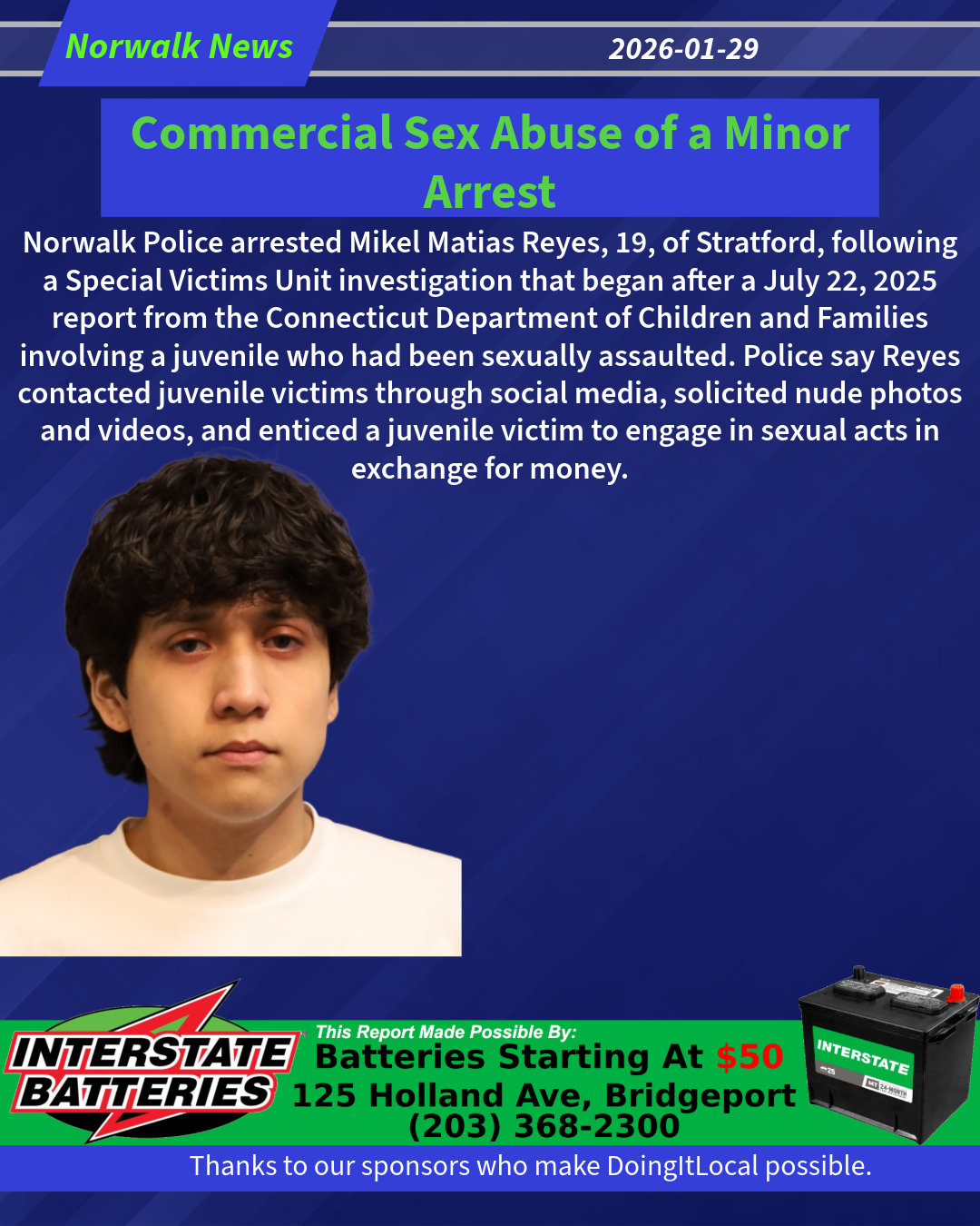 On July 22, 2025, the Norwalk Police Department’s Special Victims Unit was notified by the Connecticut Department of Children and Families regarding a report of a juvenile who had been sexually assaulted. Special Victims Unit Detective English assumed the investigation. As part of the investigation, multiple search warrants were applied for and granted by Stamford Superior Court. Detective English conducted interviews with victims and witnesses and reviewed evidence obtained through the court-authorized warrants. The investigation revealed that Mikel Matias Reyes, who was 18 years old at the time, contacted juvenile victims through social media platforms and solicited nude photographs and videos. The investigation further determined that Reyes enticed a juvenile victim to engage in sexual acts in exchange for money.…