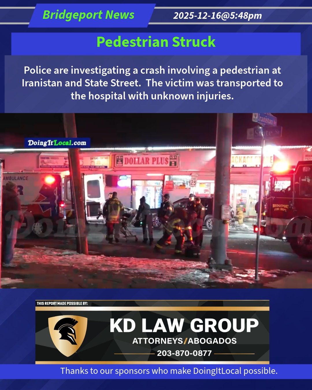 Police are investigating a crash involving a pedestrian at Iranistan and State Street. The victim was transported to the hospital with unknown injuries. 2025-12-16@5:48pm-- #Bridgeport CT