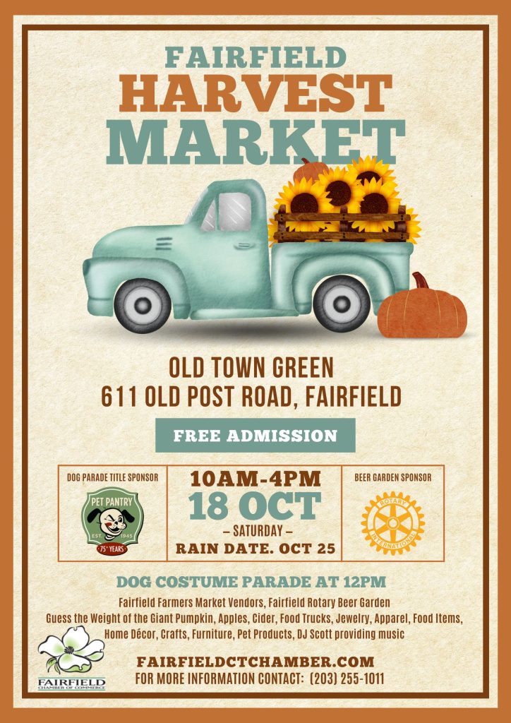 Event Details ● Event: Fairfield Harvest Market & Pet Pantry Halloween Costume Dog Parade ● Date: Saturday, October 18, 2025 (Rain Date: October 25) ● Time: 10:00 a.m.–4:00 p.m. (Dog Parade at 12:00 p.m.) ● Location: Old Town Green, 611 Old Post Road, Fairfield, CT ● Admission: Free and open to the public