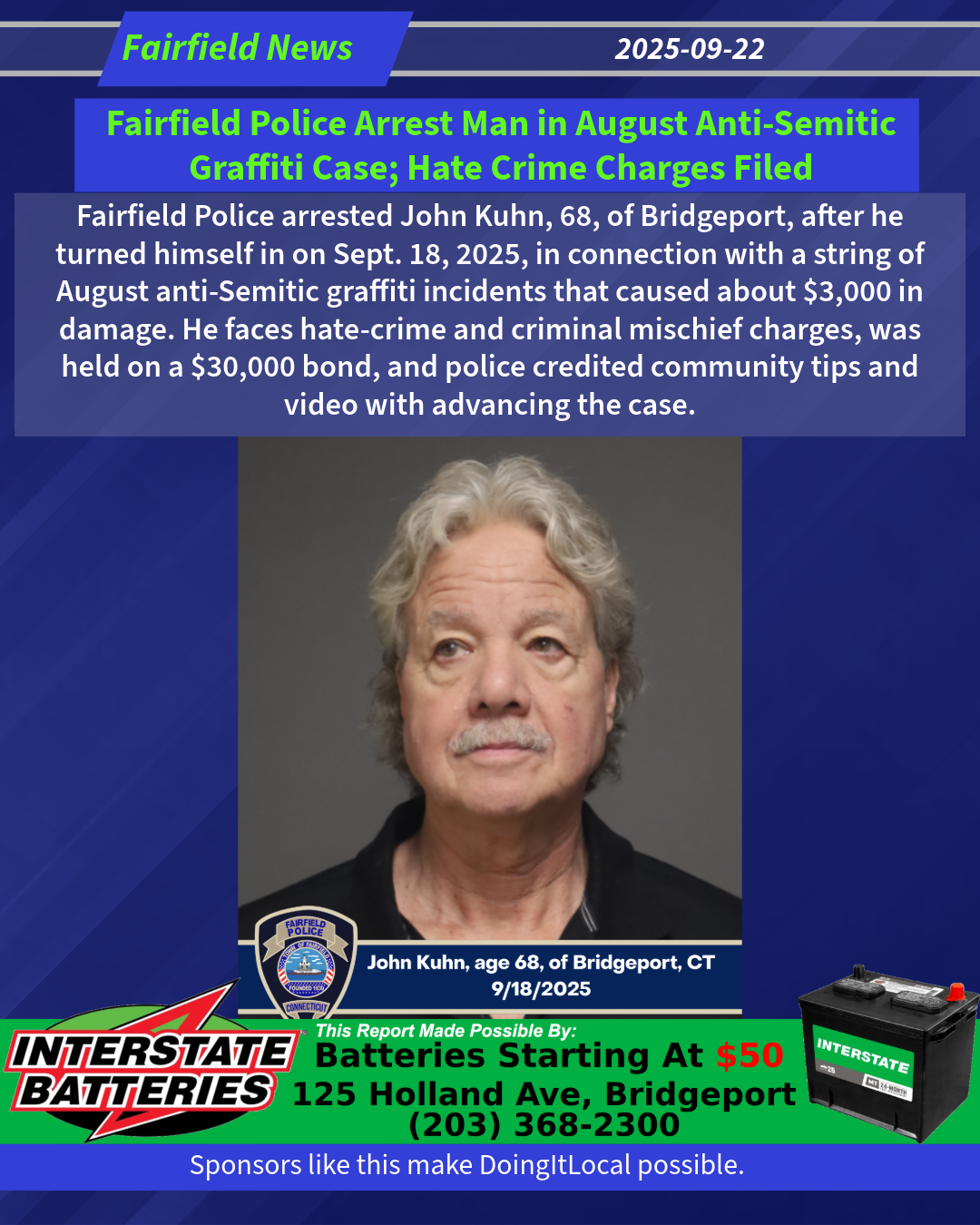 John Kuhn, 68, of Bridgeport, turned himself in at Fairfield Police Headquarters and was arrested in connection with a series of anti-Semitic vandalism incidents that occurred throughout August in Fairfield. Multiple locations were defaced with Stars of David altered with swastika-like tails, causing approximately $3,000 in damage; similar incidents were also reported in nearby communities. Following a comprehensive investigation, Fairfield Police Detectives identified Kuhn as a suspect. After interviews, detectives determined his actions were motivated by current events between Israel and Palestine. Kuhn was charged with three counts of Intimidation Based on Bigotry or Bias 3rd Degree, Criminal Mischief 1st Degree, and three counts of Criminal Mischief 2nd Degree. He was issued a $30,000 court-set bond and brought to court…