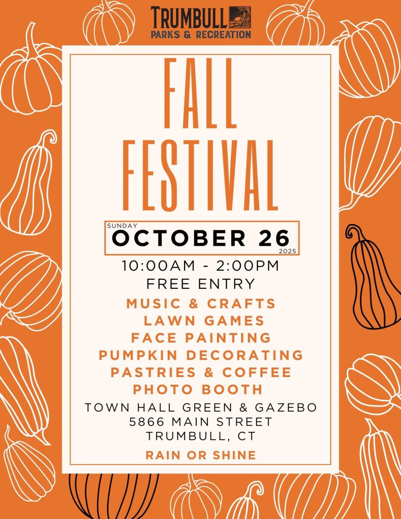 Trumbull, CT — The Town of Trumbull invites residents and visitors to the annual Fall Festival on the Town Hall Green & Gazebo—a free, family-friendly celebration featuring seasonal activities, music, and treats. The event will be held Sunday, October 26, 2025, from 10:00 AM to 2:00 PM, rain or shine.