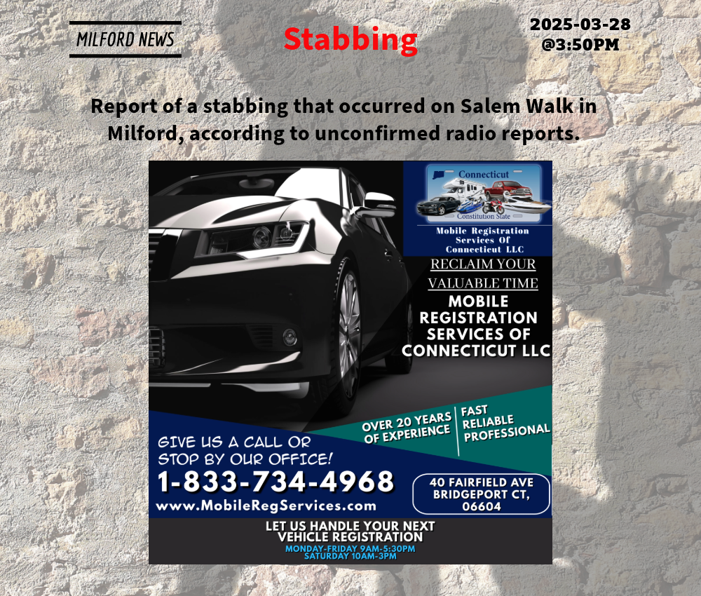 On Thursday, September 18, 2025, at about 10:00 p.m., Detectives from the Eastern District Major Crime Squad and Milford Police served an arrest warrant on Frank David of Milford. David was located, taken into custody without incident, and transported to Troop G – Bridgeport for processing. According to State Police, David is charged with Inciting Injury to Persons or Property (C.G.S. 53a-179a), Stalking 2nd Degree (C.G.S. 53a-181d), Threatening 2nd Degree (C.G.S. 53a-62), and Harassment 2nd Degree (C.G.S. 53a-183). He was held on a $250,000 court-set bond and was scheduled to appear in Milford Superior Court on September 19, 2025.