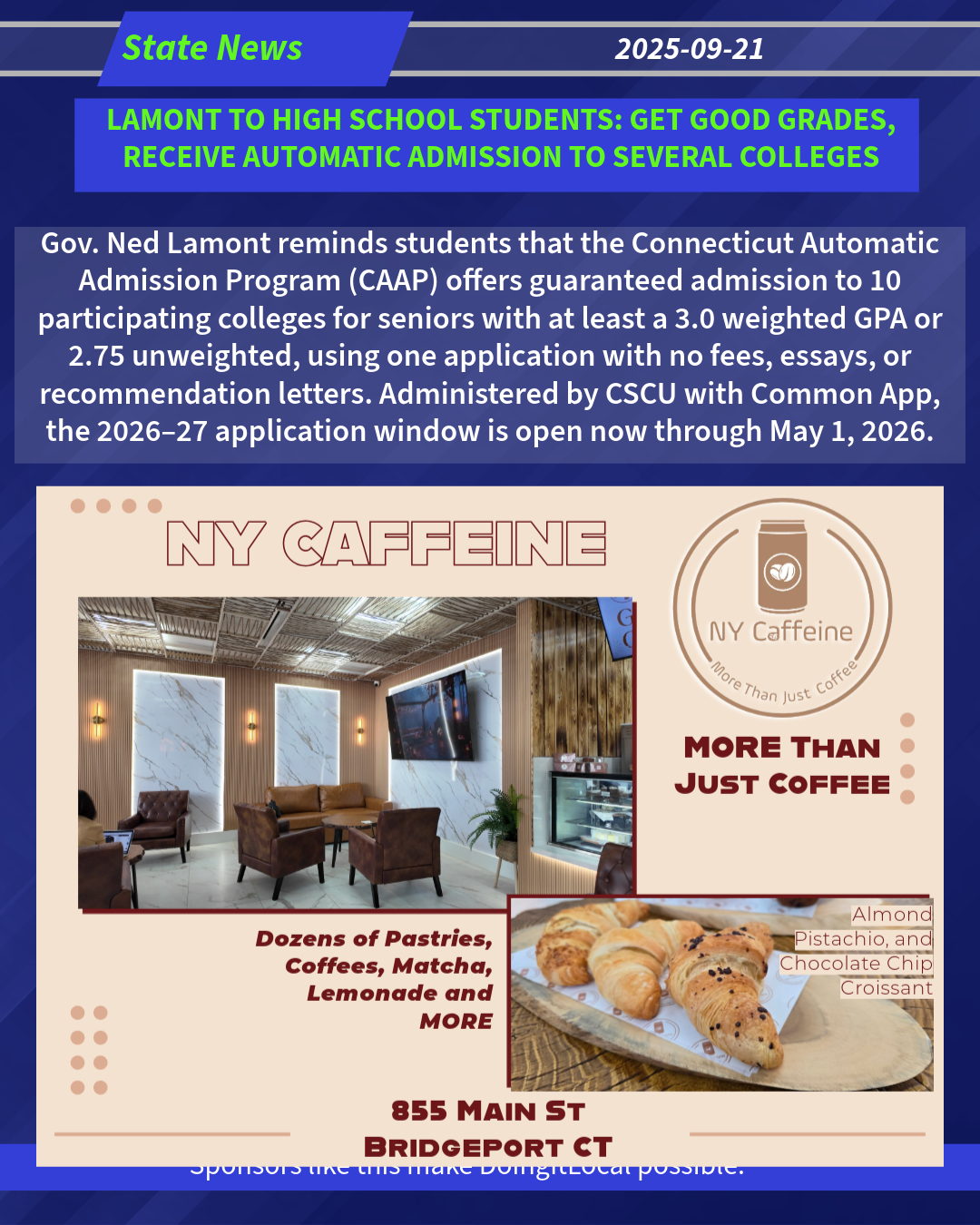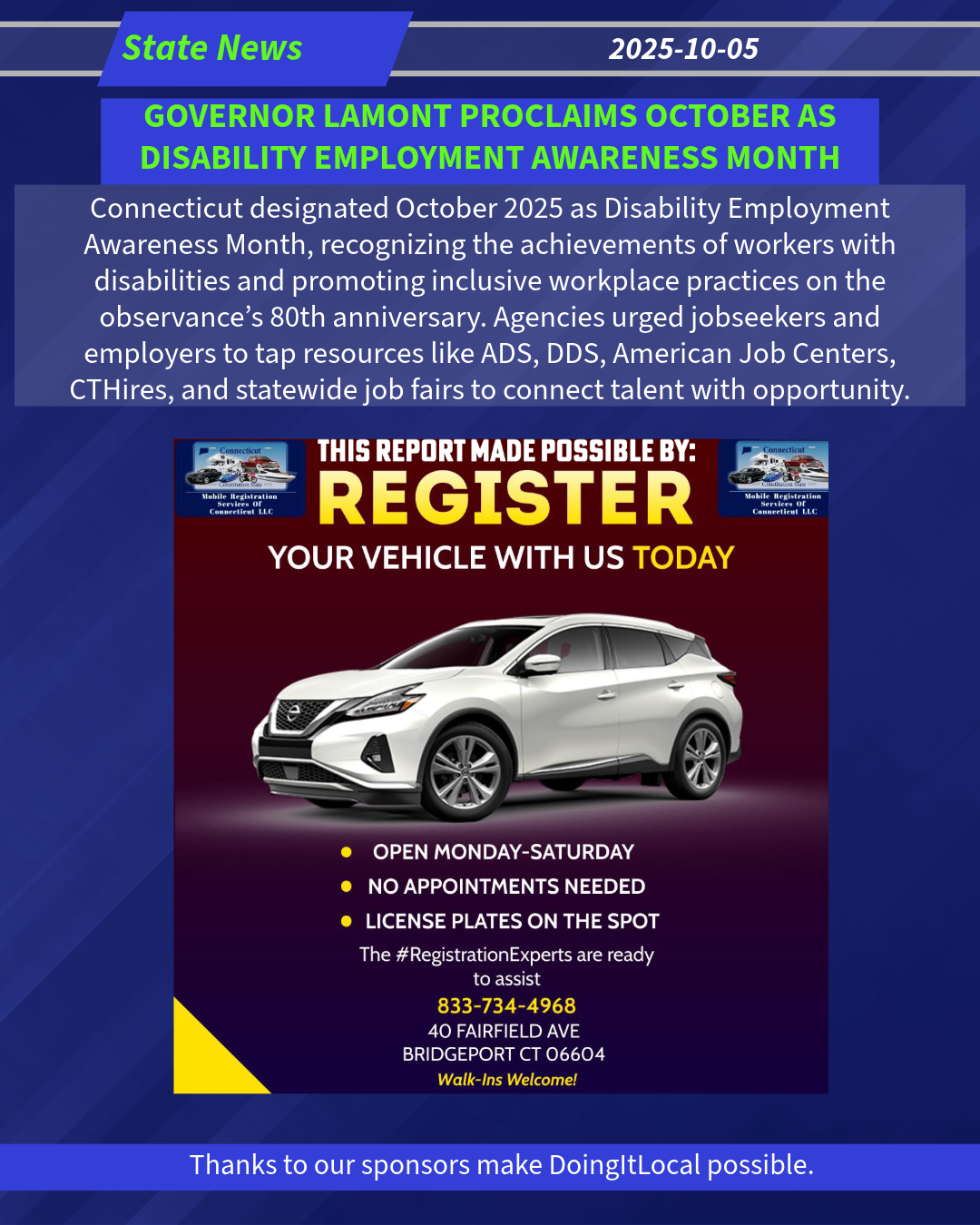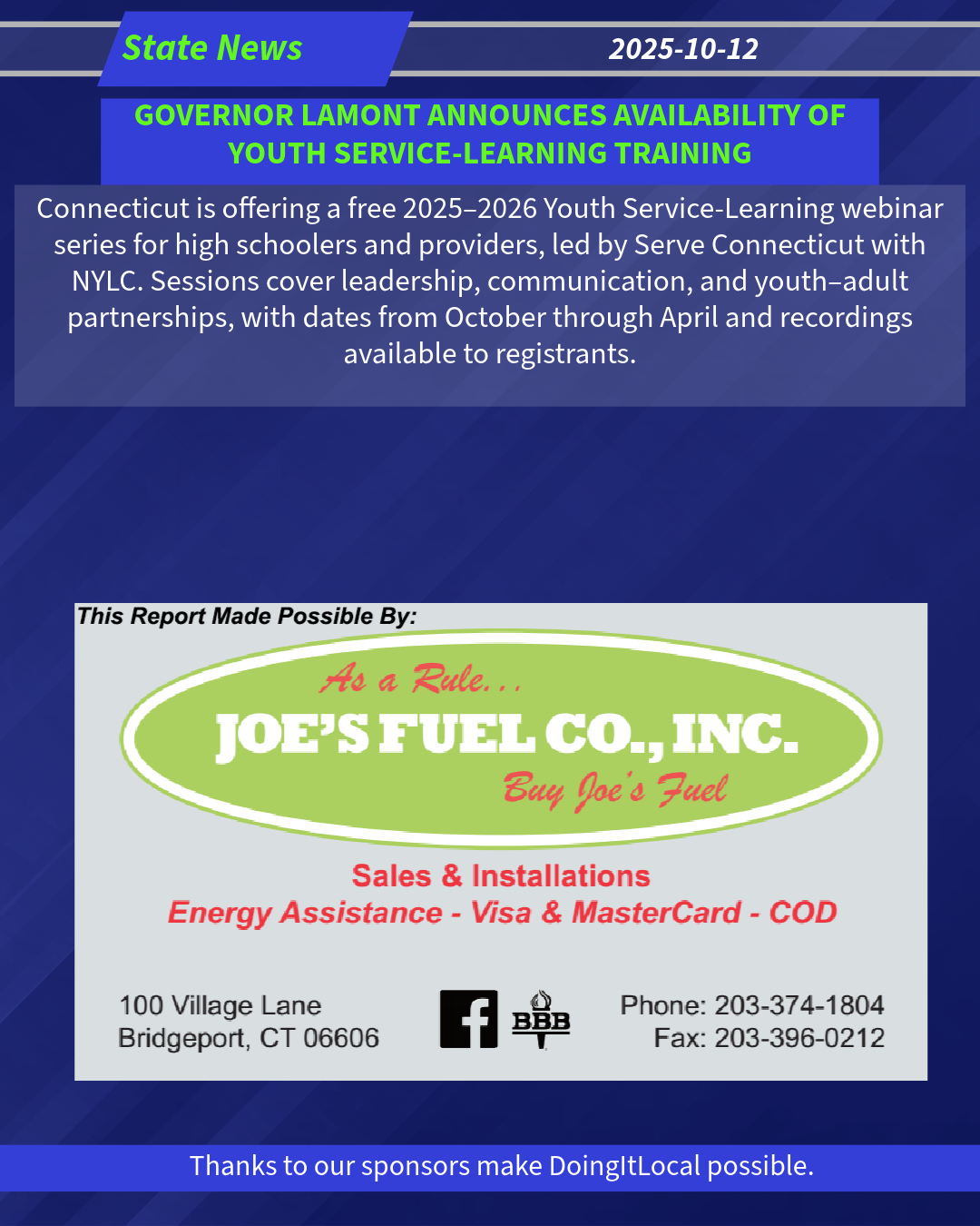 Training Webinars Available at No Cost to Participants (HARTFORD, CT) – Governor Ned Lamont and Connecticut Higher Education Commissioner Timothy D. Larson today announced the availability of a Youth Service-Learning Training Series that is being offered at no cost to participants in a series of webinars that will be held during the 2025-2026 school year between October and April. Organized by the Connecticut Commission on Community Service, also known as Serve Connecticut, in partnership with the National Youth Leadership Council, this training series is designed for Connecticut high school-aged youths and adult youth development providers, education providers, and organizations that engage with high school-aged youth through service and service-learning. It includes six live, highly interactive 90-minute webinars, including four for high school-aged…