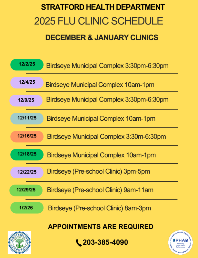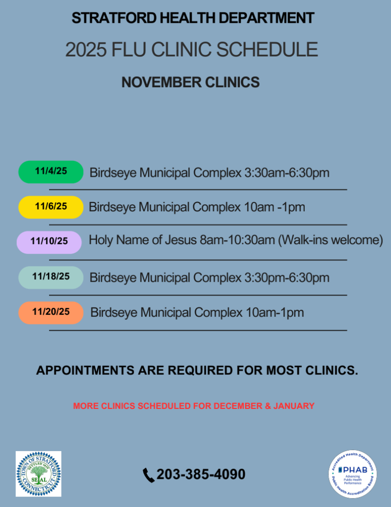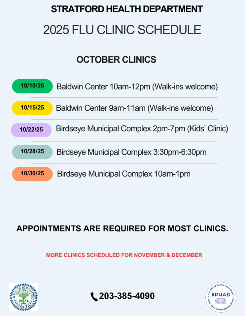 The Stratford Health Department today announced its upcoming Flu Clinic Schedule for October, November, December, and January as part of ongoing efforts to keep the community healthy throughout flu season. Clinics will be offered at multiple locations — Baldwin Center, Birdseye Municipal Complex, and Holy Name of Jesus — with both appointment-based and walk-in options. Pre-school clinics are also included in December and January to support families with young children.