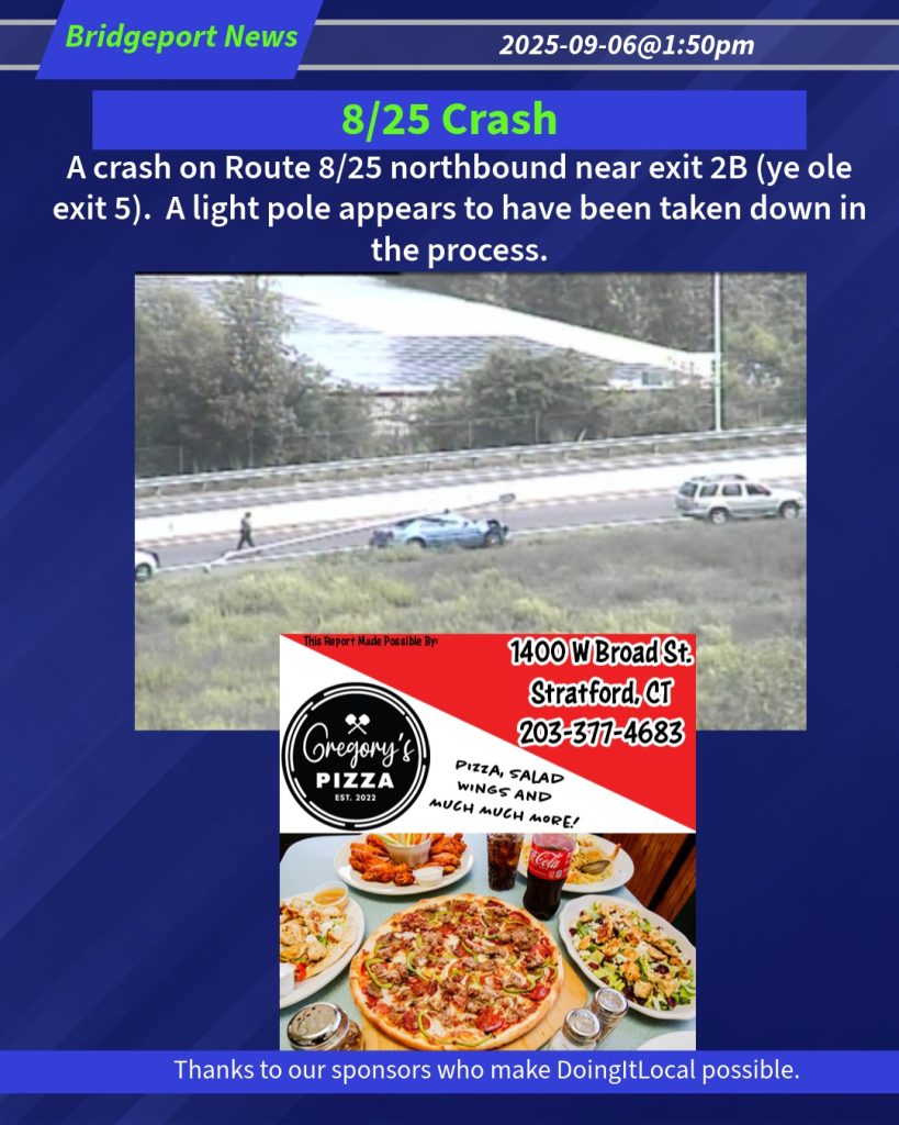 A crash on Route 8/25 northbound near exit 2B (ye ole exit 5). A light pole appears to have been taken down in the process.