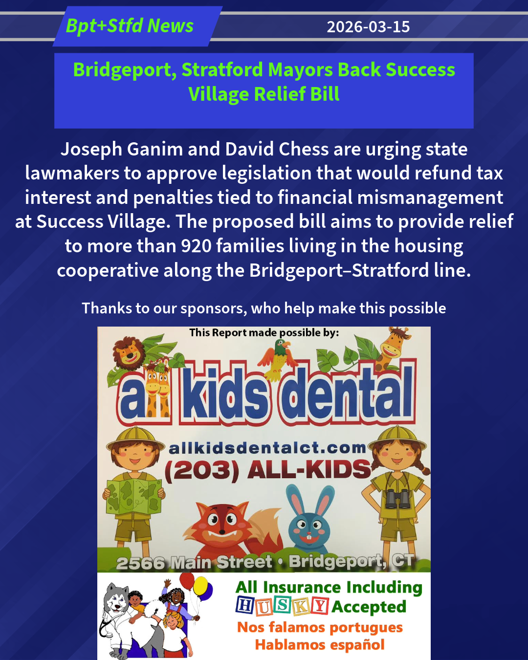 Bridgeport & Stratford, CT – Today, Bridgeport Mayor Joseph Ganim and Stratford Mayor David Chess issued a unified call for state legislative action to provide financial relief to the more than 920 families residing at the Success Village housing cooperative. In joint written testimony submitted to the Connecticut General Assembly’s Planning and Development Committee, the two Mayors voiced their strong support for House Bill 5500: An Act Concerning a Waiver of Interest on Certain Delinquent Municipal Property Taxes. The bill seeks to refund tax interest and penalties accrued since July 1, 2022—costs incurred not by the residents themselves, but by documented financial mismanagement that left the cooperative in a state of crisis. "The residents of Success Village are the victims of this mismanagement, not…