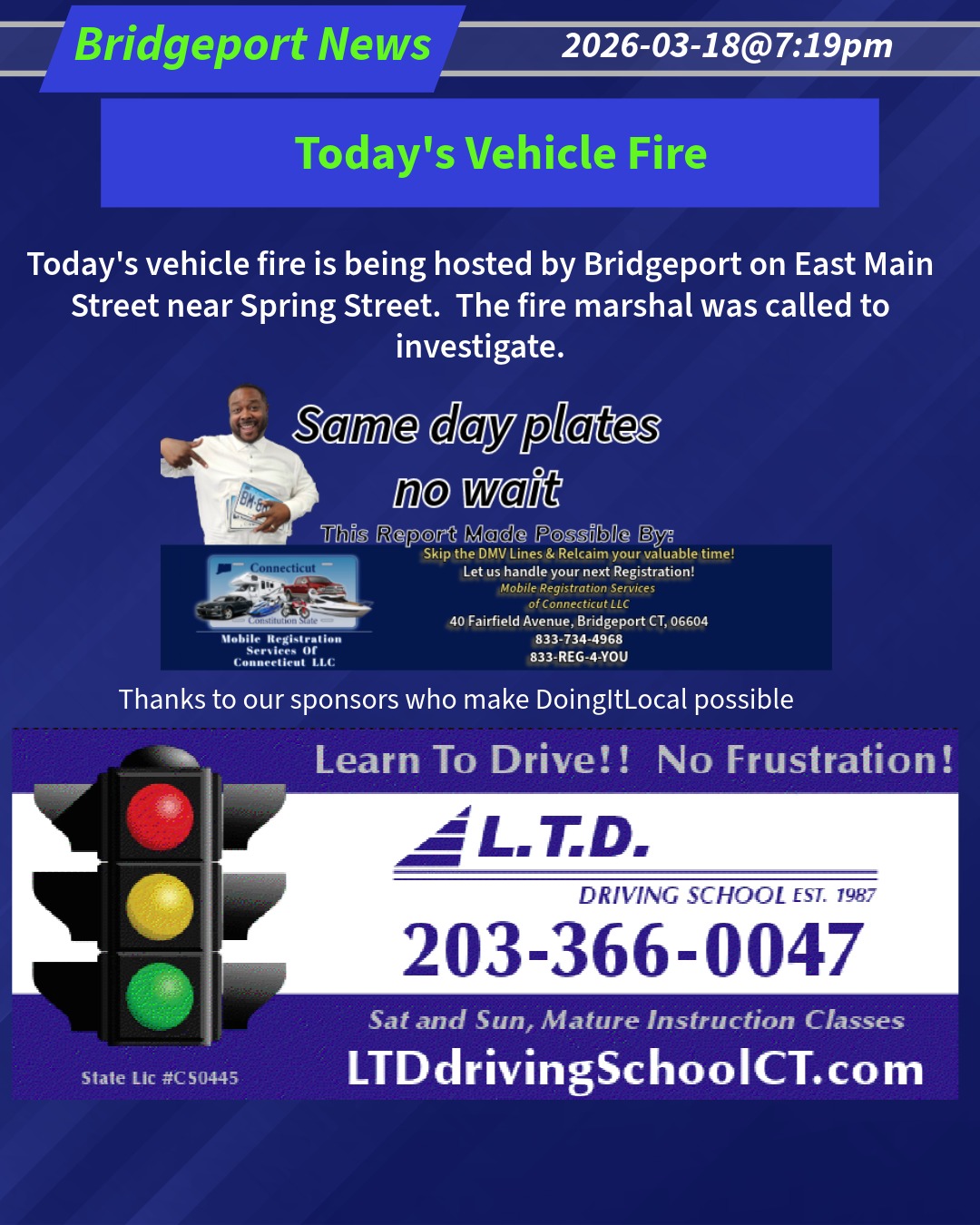 Today's vehicle fire is being hosted by Bridgeport on East Main Street near Spring Street. The fire marshal was called to investigate. 2026-03-18@7:19pm