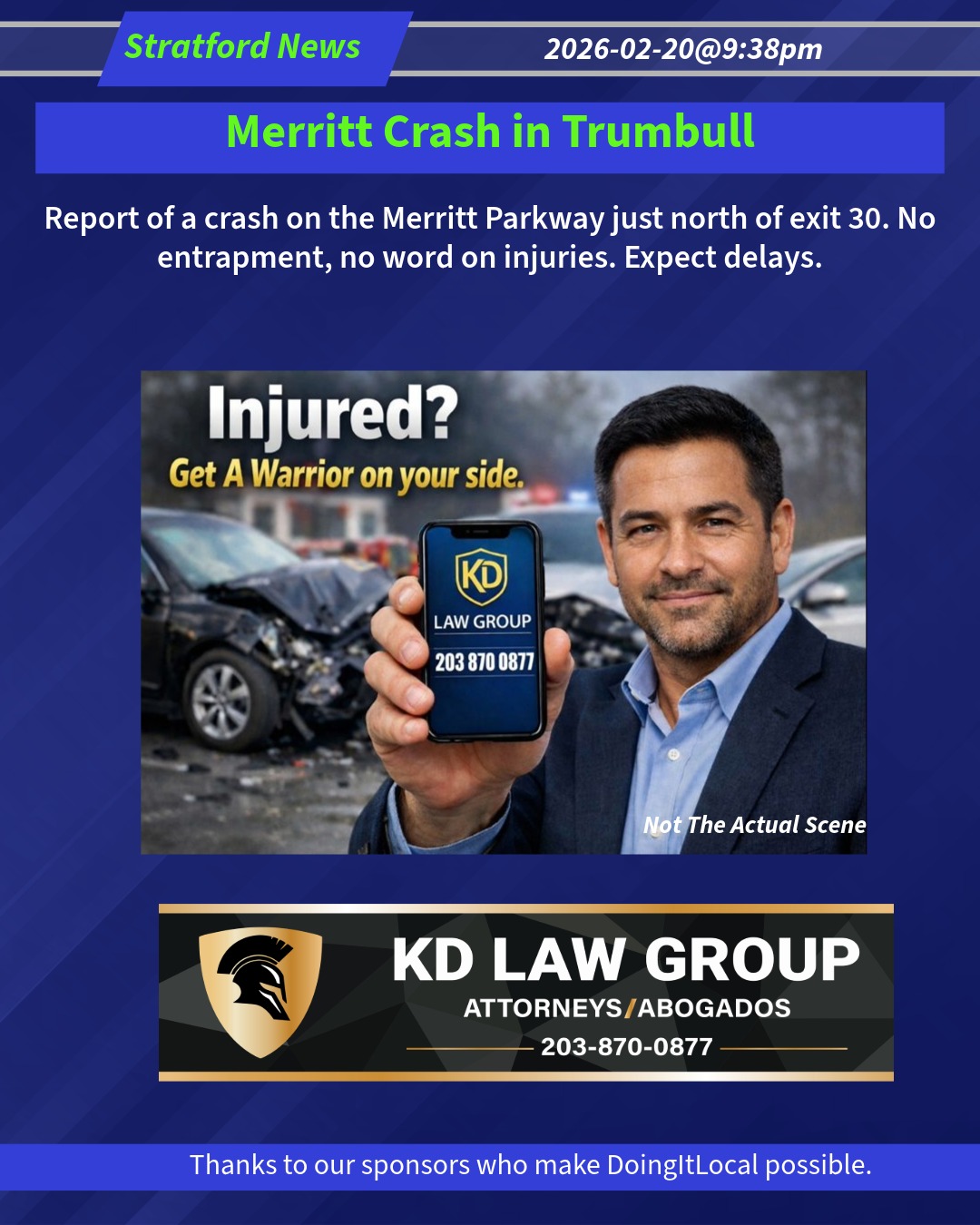 Report of a crash on the Merritt Parkway just north of exit 30. No entrapment, no word on injuries. Expect delays. 2026-02-20@9:38pm