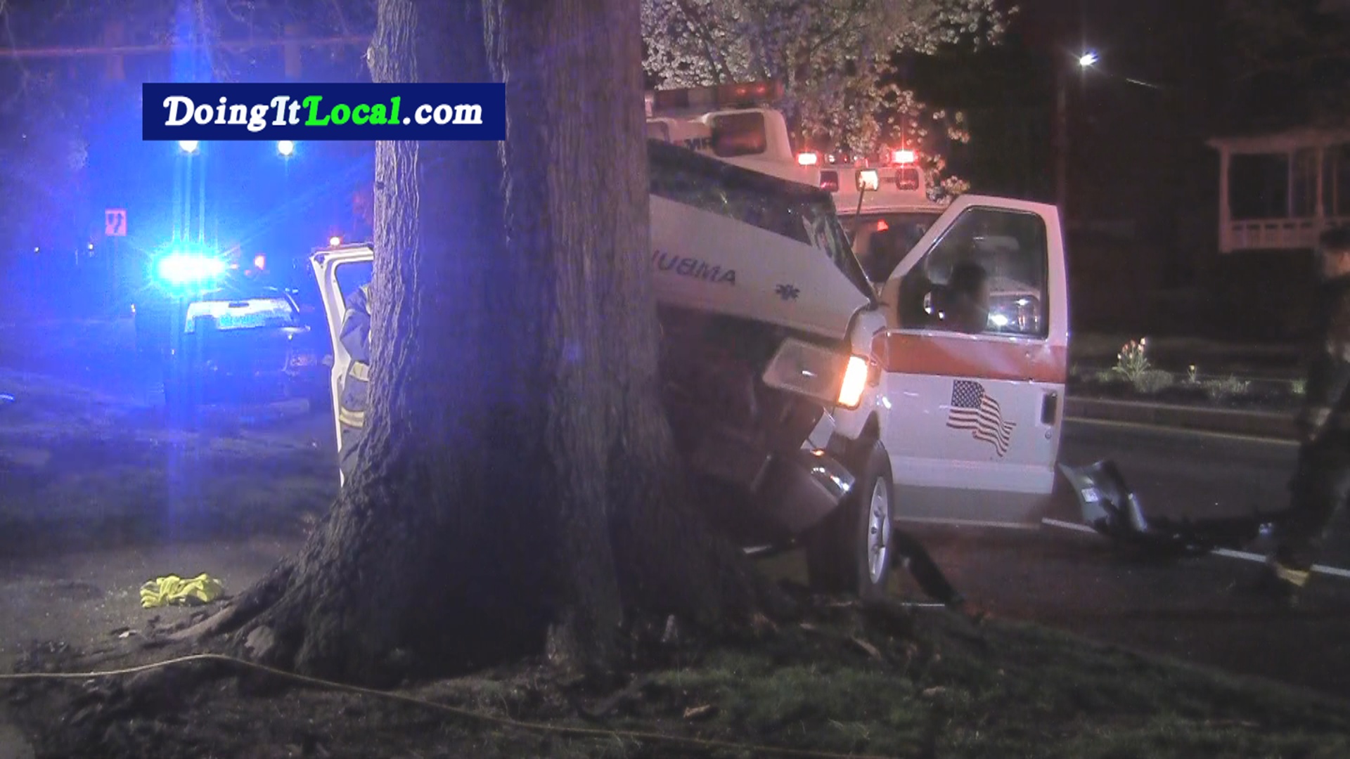 2:25am--#Bridgeport CT-- Witnesses said a car ran the red light at North and Wood Avenue forcing an AMR ambulance off the road.  The ambulance hit a parked car and then a tree head on.  An AMR medical student was pinned in the passenger seat and it took firefighters over a half hour to free her.  After sorting through all the debris police located the front bumper of the responsible vehicle with its license plate still attached.  Police told me the went to the address the car was registered to.  They found two men in the backyard on Everett Street in Bridgeport.  They admitted to being in the accident.  The driver told police he was afraid because he did not have…